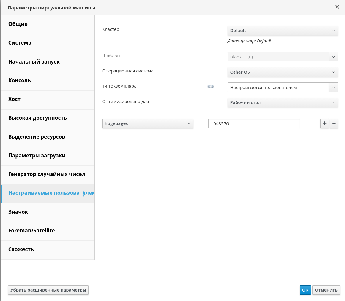- На вкладке" Настраиваемые пользователем параметры" (рисунок 37) выберите в списке пункт "Огромные страницы (hugepages)".