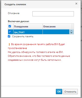 Примечание — Если диски не были выбраны, будет создан частичный снимок ВМ без дисков.