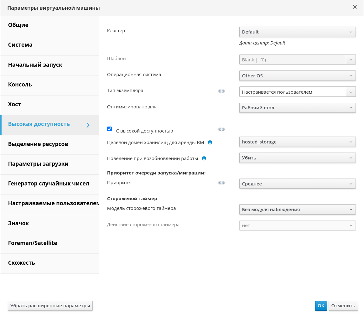 - Для активации механизма высокой доступности ВМ установите флажок "С высокой доступностью".