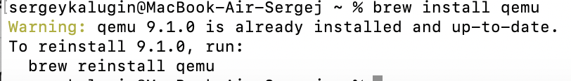 - проверить, что виртуализатор определяется ОС с помощью выполнения команды "brew install qemu" в консоли терминала (рисунок 17);