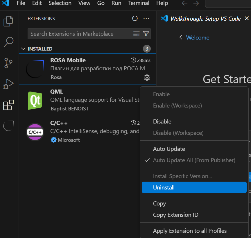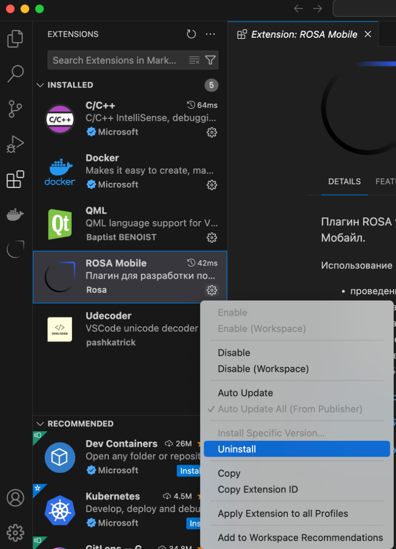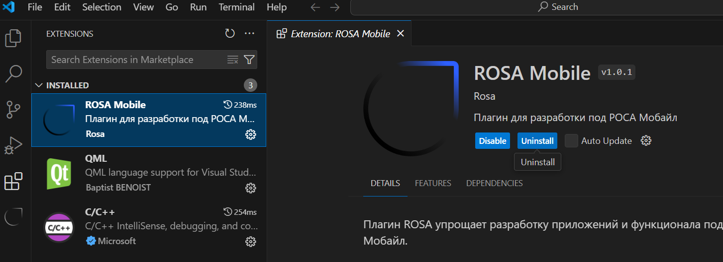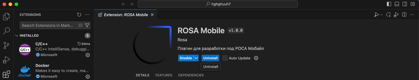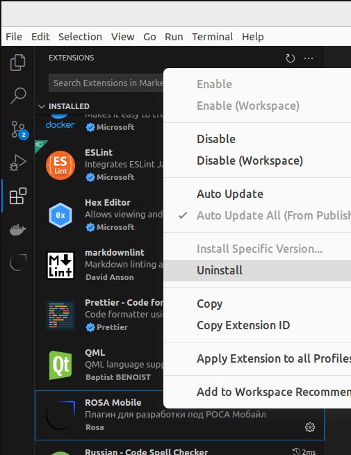 Плагина ROSA Mobile можно удалить с использованием стандартного функционала Microsoft Visual Code Studio.