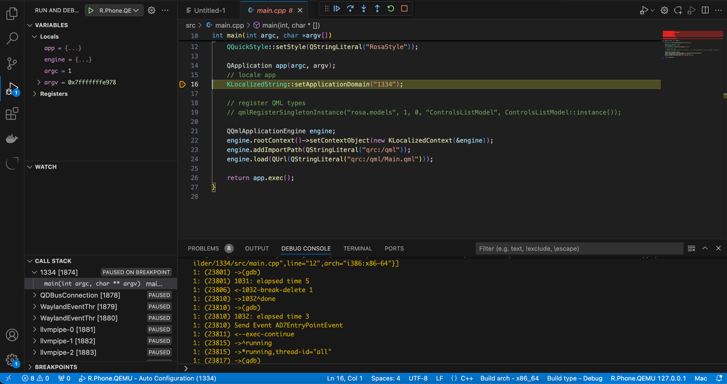 После успешного запуска удаленного отладчика перед пользователем должны открыться системный бар управления отладкой и Debug Console.